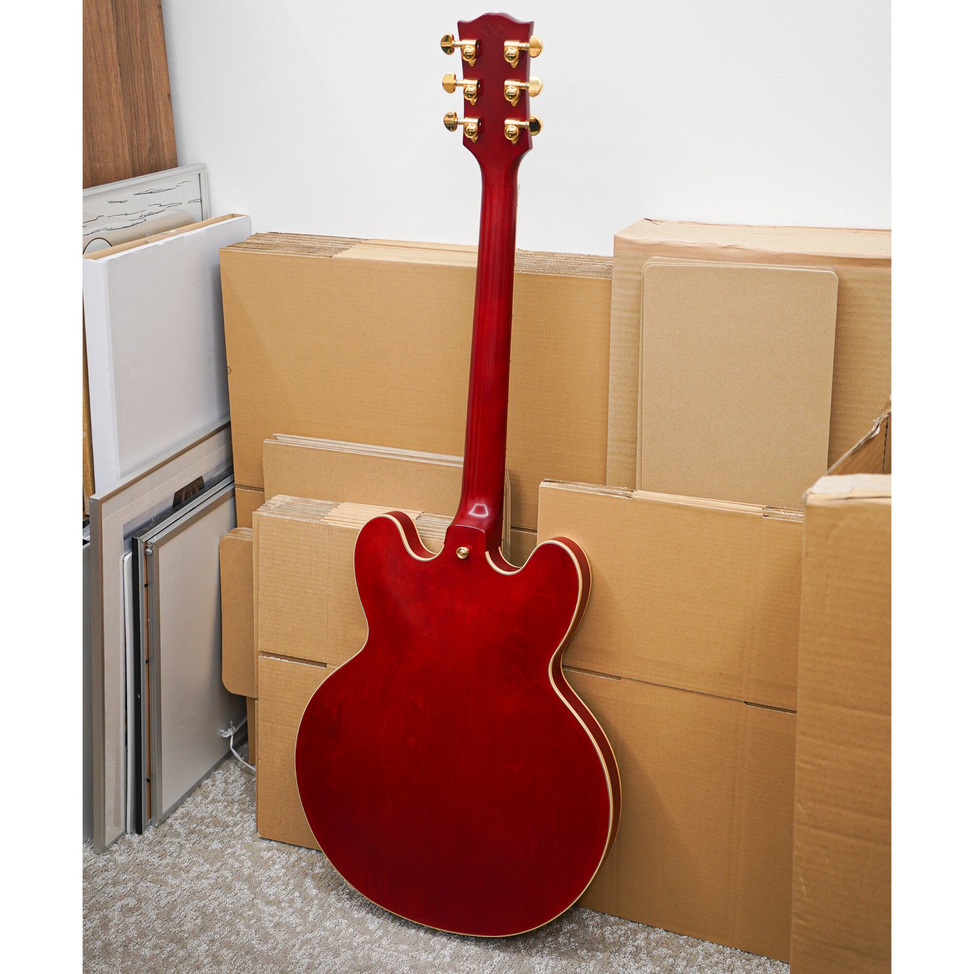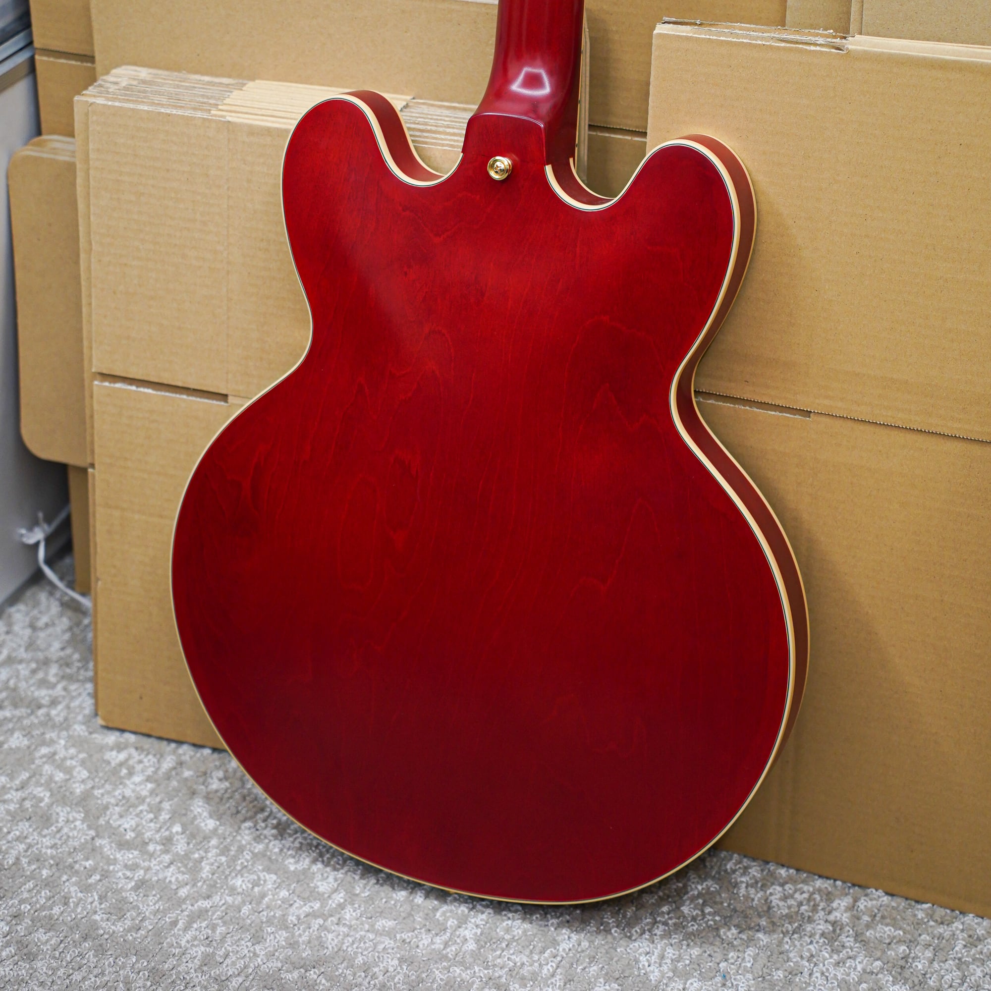 ES-355はESシリーズの中で最上位モデルであり、ボディの寸法、ボディトップ・コンター、インレイ・パターン、音響特性まで再現されています。違いはフィニッシュで、GIBSONのグロスフィニッシュに対して本製品はサテンフィニッシュになっています。